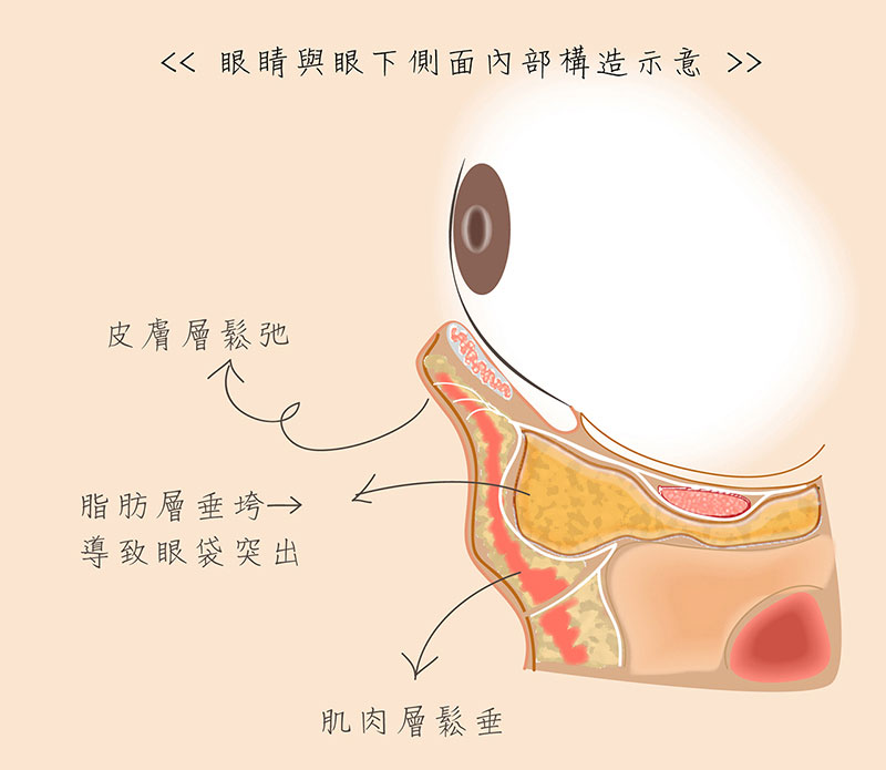 眼袋的形成,除了年紀增長老化及重力的影響之外,長時間熬夜或身體狀況不佳都會使眼袋更加明顯,眼袋的形成可分為先天型及後天型
