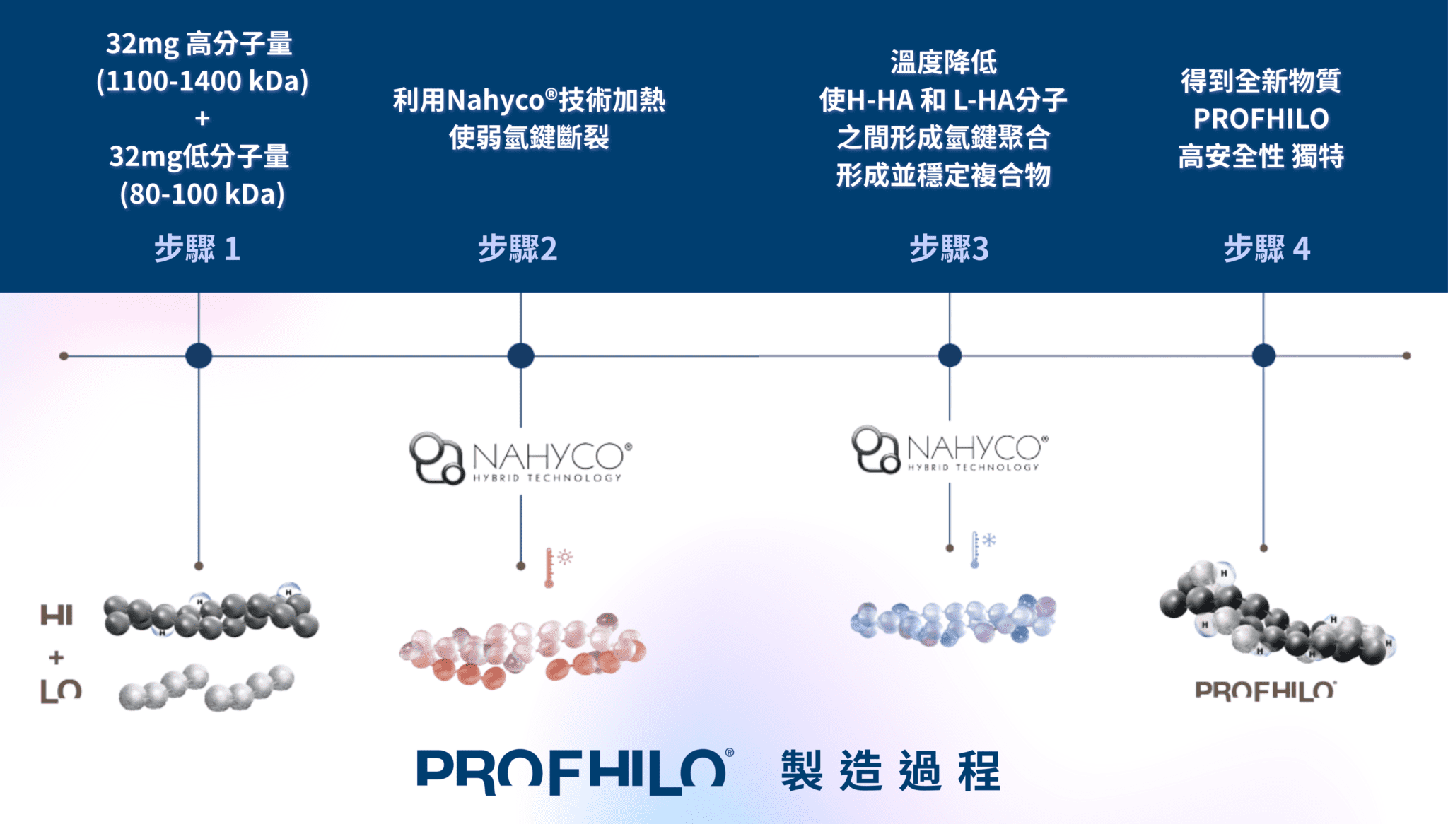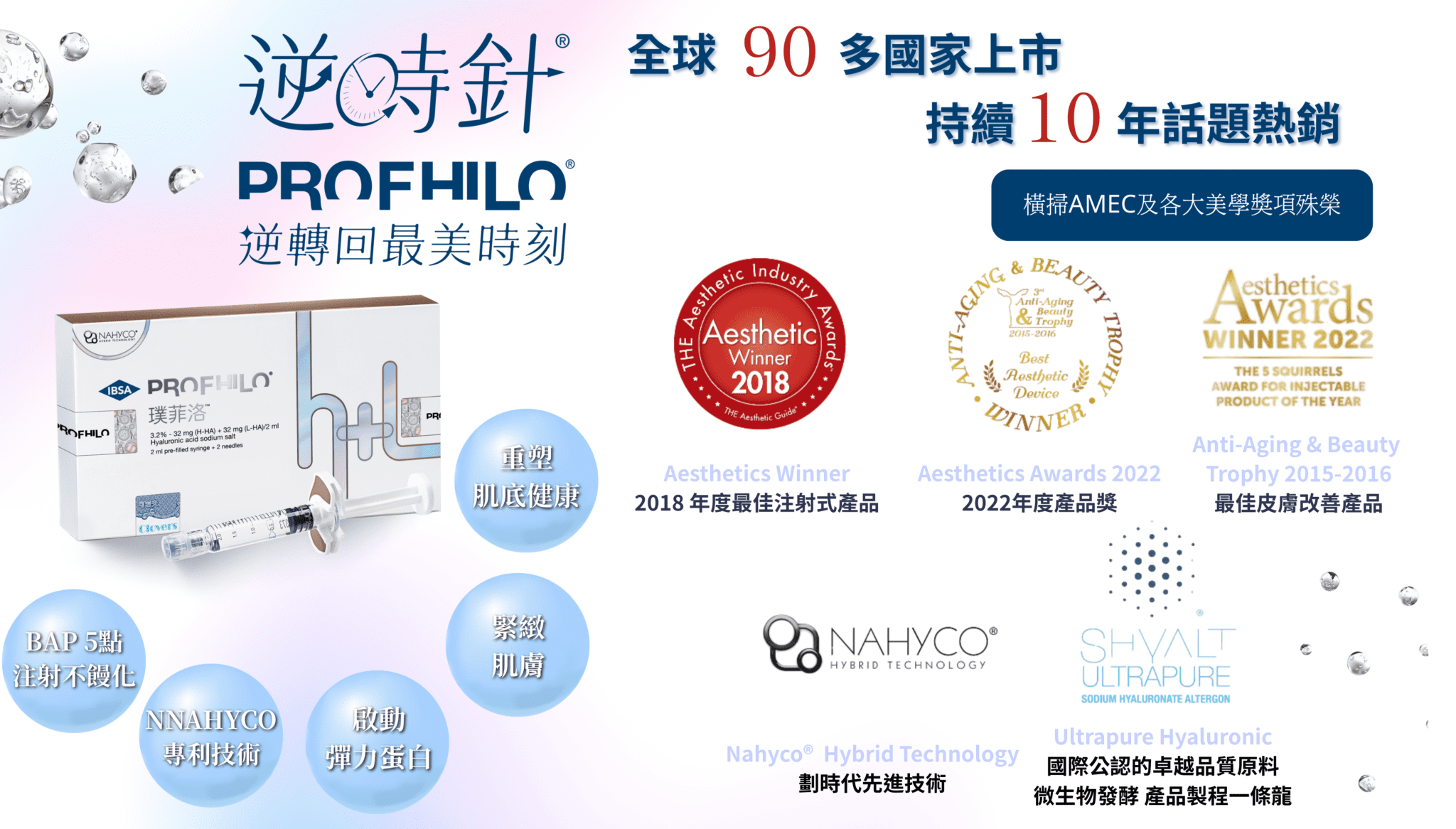 PROFHILO 逆時針是什麼 逆時針Profhilo源自瑞士IBSA Derma的研發成果,跳脫傳統僅以填充或拉提為目的的療程,強調透過高濃度、純淨且無交聯劑的透明質酸注入,迅速滲透並均勻作用於肌底,深度補水的同時刺激膠原蛋白與彈力纖維新生,可改善乾燥、鬆弛、細紋等老化現象。專注於肌膚質感的提升,讓臉龐恢復彈潤、緊緻與光澤,效果自然不做作。逆時針因其高安全性與漸進式的改善效果,在全球醫美市場備受矚目,並被譽為抗老領域的重要里程碑,幫助更多人以更科學、更有效的方式逆轉時光、重拾年輕膚況 PROFHILO 逆時針的逆轉關鍵 1.雙重分子量設計(Hybrid Cooperative Complexes, HCC) PROFHILO將高分子量與低分子量的透明質酸結合在一起:• 低分子量 HA : 促進纖維母細胞(fibroblasts)、角質細胞(keratinocytes)與脂肪幹細胞(adipocytes)的活化,誘導膠原蛋白與彈力蛋白的生成。• 高分子量 HA : 在皮膚內形成穩定的「水合作用」網絡,維持組織張力,提供結構支撐。 2.Bio-Remodeling 生物重塑PROFHILO將高分子量與低分子量的透明質酸結合在一起:PROFHILO並不是傳統的填充劑,而是啟動皮膚內部再生機制的產品。研究顯示它能活化皮膚細胞,促進 Type I 與 Type III膠原蛋白,以及彈力蛋白(elastin)的合成。3.緩慢釋放與廣泛擴散它在皮下緩慢釋放 HA,並且具有極高的擴散性,能均勻分佈在真皮層,達到全面性的緊緻與改善鬆弛。 4.膠原彈力新生即時保濕、長效滋養,讓營養分子層層浸潤,啟動膠原與彈力蛋白再生機制,打造緊緻澎潤的好膚質。 為甚麼小分子玻尿酸無法啟動彈力蛋白 PROFHILO 逆時針的獨特之處 NAHYCO® 專利混合技術 一般玻尿酸濃度越高,質地就會越稠密、硬度增加,注射時阻力大,流動性與擴散性也會受限。Profhilo 逆時針則不同,它選用高品質的超純淨玻尿酸(Ultrapure Hyaluronic Acid),在維持高濃度的同時仍具備極佳的流動性與擴散力。這使得治療只需少量注射點,就能作用於更廣泛的肌膚範圍,而核心關鍵就在於 NAHYCO 專利製程技術。此技術在完全不添加化學交聯劑的情況下,精準結合高分子量玻尿酸(H-HA)與低分子量玻尿酸(L-HA),創造出獨特的 雙重複合體(Hybrid Cooperative Complexes),帶來更持久、更自然的肌膚改善效果。。 PROFHILO 逆時針的製造過程 精準掌控|安全自然、舒適體驗 PROFHILO 施打時注重細節與準確度,讓效果更自然,同時降低不適感 : 臉部精準注射 – BAP 五點法Profhilo 的 BAP 五點注射法 是針對臉部老化設計的專利注射點位,每側五個特定位置可最大化透明質酸的分布效果。透過這些點位,療程能同時改善面部鬆弛、提升輪廓線條、增加肌膚彈性與光澤,達到全面膚質重塑的效果,而不需要多次或大量注射。 頸部專屬注射 – 十點法針對頸部肌膚老化,Profhilo 採用 十點注射法,精準作用於鬆弛、紋路及乾燥區域。每個注射點都能刺激肌膚底層自我修復機制,促進膠原蛋白再生,讓頸部肌膚更緊緻、水潤且自然,改善脖紋與肌膚鬆弛問題。 PROFHILO 逆時針原廠真實案例 1次治療後 (每年治療頻率為3次) 常見問題 Q&A PROFHILO逆時針療程會痛嗎?PROFHILO逆時針以5點進行注射,最大程度提高治療舒適度並大幅降低注射引起的傷害,使療程更安全,迅速有效。PROFHILO逆時針要打多少次?PROFHILO逆時針治療次數為三次,第2次須相隔一個月,4-6個月後注射最末次,或經醫師專業評估後可進行加強療程。PROFHILO逆時針能維持多久?PROFHILO逆時針效果因人而異,通常可以持續12個月。會依據皮膚狀況、年齡以及生活方式等因素影響。隨著逆時針療程的進行,您會發現肌膚逐漸變得更加緊緻、細緻且充滿光澤,持久保持年輕健康的膚質。如果希望延長逆時針效果,可以在專業治療師的指導下安排定期PROFHILO逆時針療程。哪些人不適合PROFHILO逆時針療程呢?所有人都適合 !除了本身對玻尿酸有嚴重過敏反應的人不適合,及仿單上不得治療者除外皆可治療。PROFHILO逆時針跟水光有甚麼不同?不同於水光僅能表層滋潤肌膚,PROFHILO逆時針可以全面多層次擴散並可以喚醒角質形成細胞、脂肪細胞、膠原蛋白及彈力蛋白的修復與新生,不靠傷害而是透過均勻擴散傳達訊號的概念,使肌膚整體緊實彈性 !PROFHILO逆時針安全嗎?PROFHILO逆時針為瑞士知名藥廠IBSA生產,全球已熱銷超過十年,每年有高達幾百萬隻的使用量,且有觀察三年囊括40,000例的安全性評估文獻紀錄,正確注射使用下並無任何一例可直接歸因於產品的不良反應,是高度安全性的產品,可以放心施打。